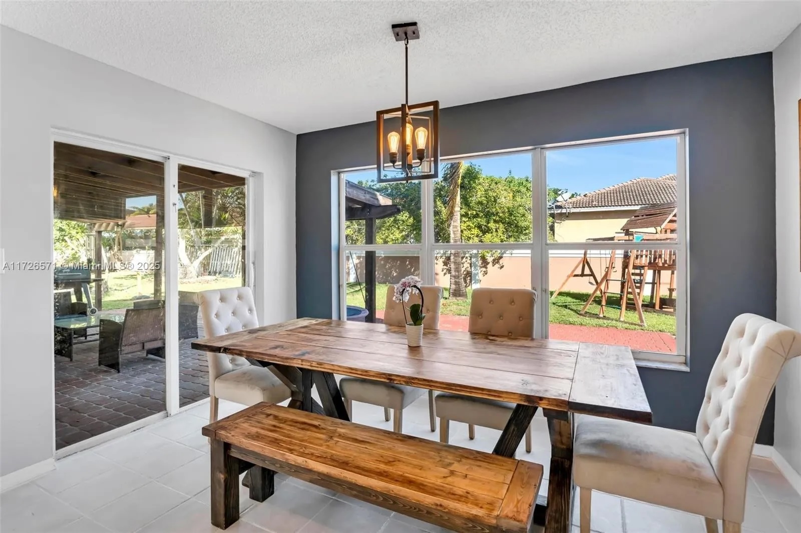 Step outside into the beautifully landscaped backyard, an ideal spot for outdoor gatherings or quiet relaxation. The patio area is furnished with a dining set and lounge chairs, perfect for alfresco dining or soaking up the sun. The house also includes a two-car garage, providing ample storage space and secure parking.